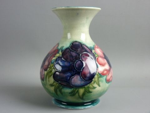 A MOORCROFT ANEMONE BULBOUS VASE decorated on a muted green ground, impressed and painted 'W M' monogram to the base (crazing), 16 cms high