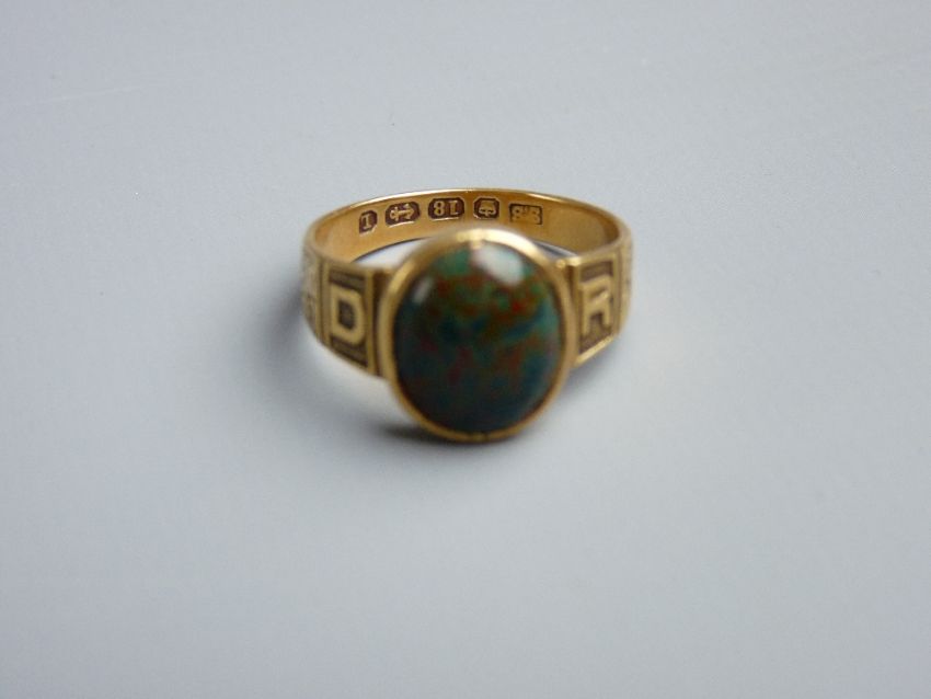AN EIGHTEEN CARAT GOLD LOVER'S RING with a centre oval bloodstone - 'REGARD', 5.8 grms