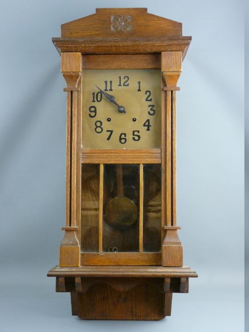A VINTAGE OAK CASED WALL CLOCK, the gold coloured dial set with Arabic numerals and twin winding apertures before a pendulum driven gong striking movement, 80 cms high, 37 cms wide