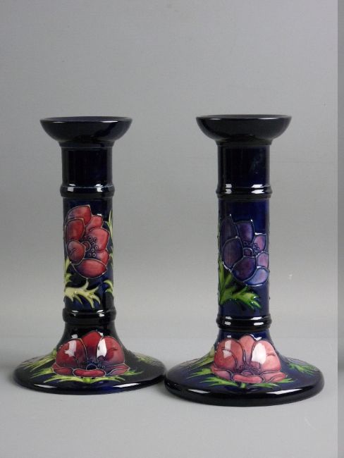 A PAIR OF MOORCROFT ANEMONE CANDLESTICKS decorated on a cobalt blue ground, impressed factory marks and 'W M' monogram in green to the base, 21 cms high (very light crazing)