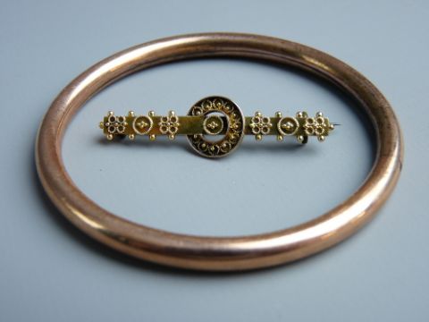 A NINE CARAT GOLD FILIGREE DECORATED BAR BROOCH, 2 grms and a plain nine carat gold 'copper lined' plain bangle, 12.5 grms gross