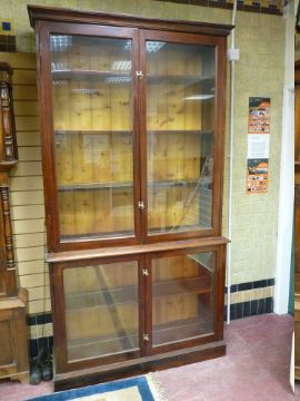 A VINTAGE TWO PIECE STAINED PINE BOOKCASE having twin glazed doors to the upper and base sections with adjustable interior shelves, 237 cms high, 127 cms wide