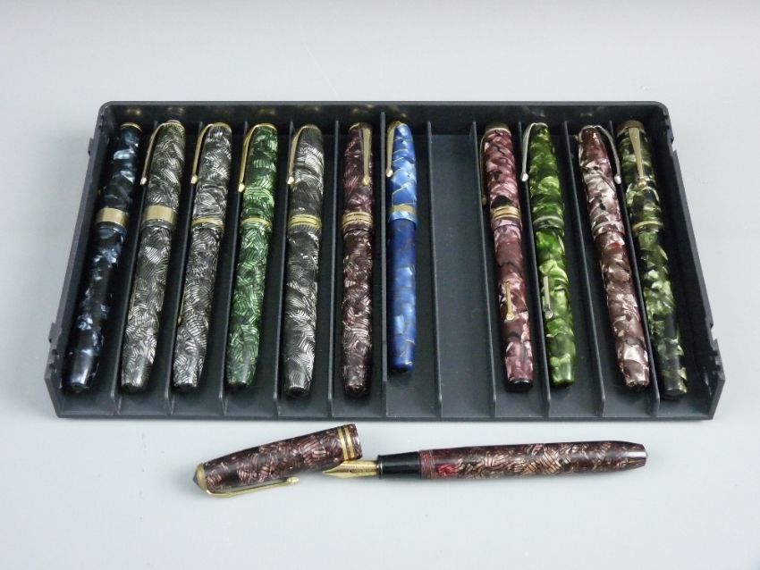 A COLLECTION OF TWELVE VINTAGE MARBLE PATTERN FOUNTAIN PENS to include a Conway Stewart 27, an Executive 60, two 28s, two 58s, one 84, one 24, one 388, one 70, one 75 and a Mentmore Autoflow, all with fourteen carat gold nibs