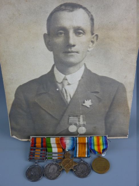 A WELSH REGIMENT BOER WAR WWI GROUP OF FIVE MEDALS to Pte E Jones with a photograph of the recipient wearing the first two, Queens South Africa with clasps, Relief of Kimberley, Paardeberg, Driefontein and Belfast and Edward VII South Africa with clasps for 1901 and 1902, both marked 5782 Pte E Jones, Welsh Regt, a 1914/15 Star, a 1418 British War medal and Victory medal, all marked 422098 Pte E Jones 8/CAN.INF