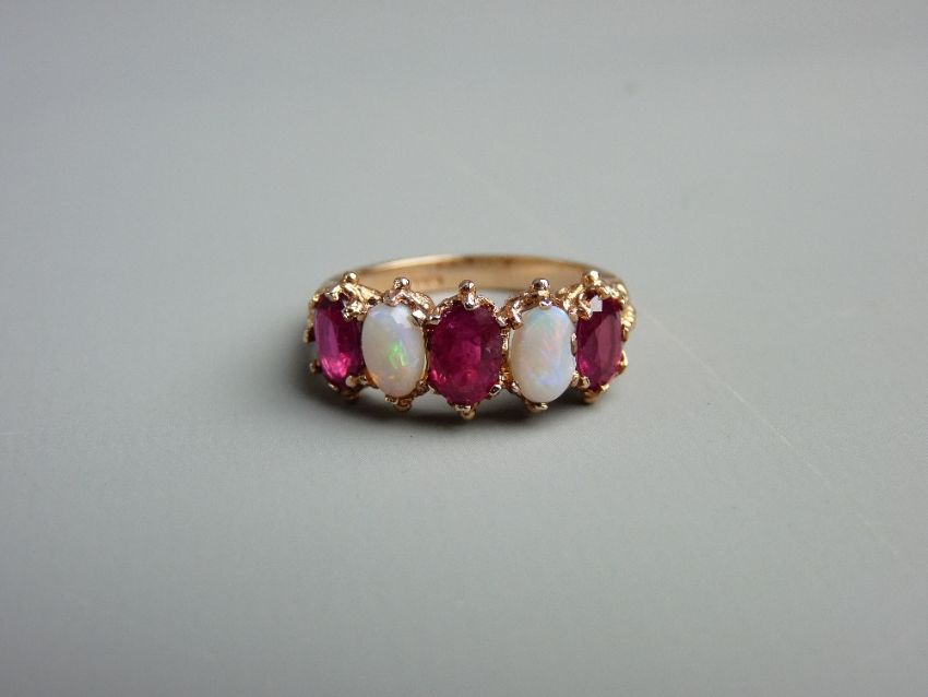 A FIFTEEN CARAT GOLD RUBY (three) & OPAL (two) DRESS RING, all oval cut stones, size 'O/P', 4.5 grms
