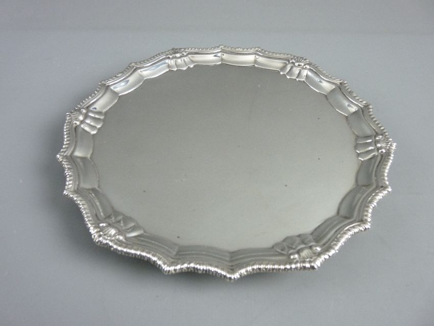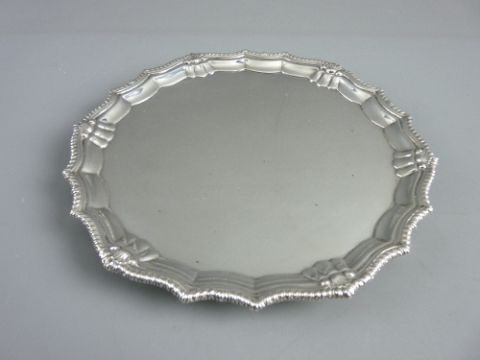 A SILVER CARD TRAY ON THREE HOOF FEET, 19 cms diameter with rope and shell decorated border, Birmingham 1959, 7.2 troy ozs