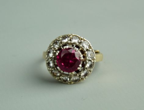 A NINE CARAT GOLD DRESS RING with centre pink stone and twelve small surrounding diamonds, 4.5 grms, 'M' fitting