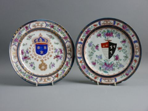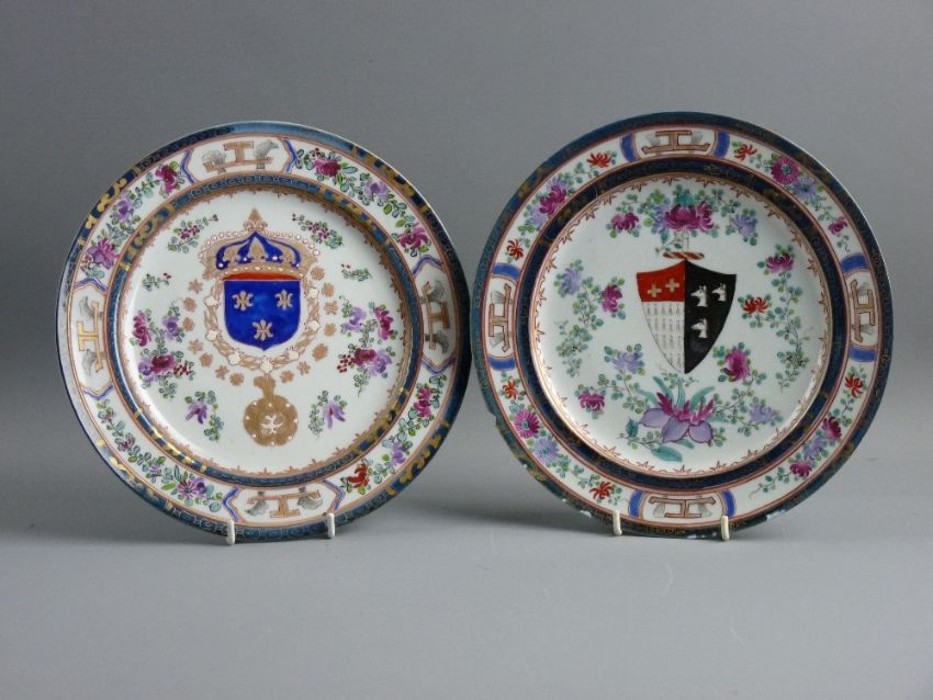 TWO SAMSON ARMORIAL PORCELAIN PLATES, late 19th Century decorated in the Oriental style with enamel floral sprays and gilt highlighting, each with an individual coat of arms, 24 cms diameter (edge chipped to one)