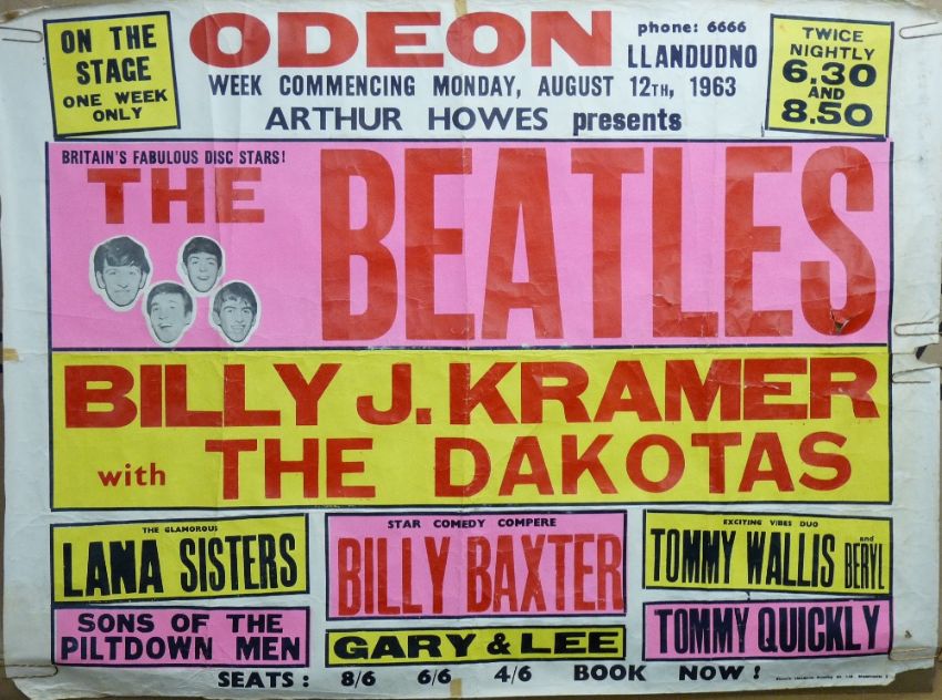 1963 BILL POSTER FOR THE ODEON, LLANDUDNO INCLUDING THE BEATLES as headline act, dated Monday, August 12th. In addition to The Beatles, the line-up billed as Billy J Kramer & The Dakotas, The Lana Sisters, Billy Baxter, Tommy Wallis & Beryl, Tommy Quickly, Gary & Lee, Sons of the Piltdown Men, printed in three colours by Electric Printing Co Ltd, Manchester standard British Cinema quad size, 75 x 105 cms (some loss and tears),Provenance: directly from our client in South Wales, the folk-singer Mary Hopkin who was one of the first signatures to The Beatles' Apple labelPlease note that we have more excellent Beatles memorabilia in the pipeline