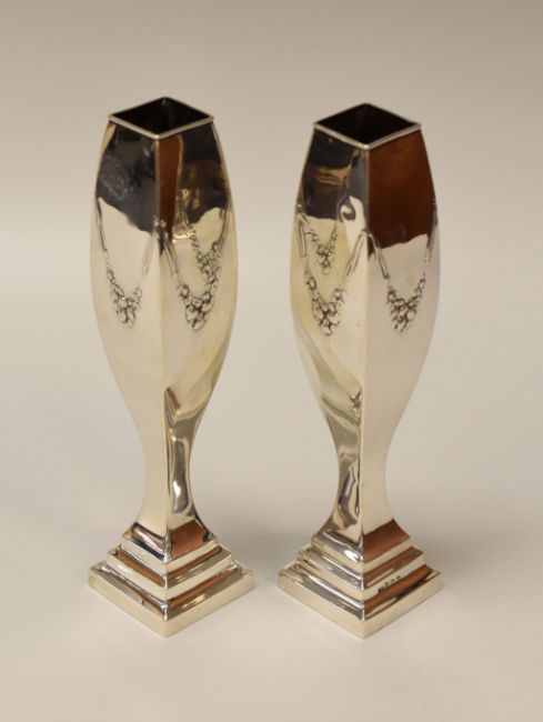 A PAIR OF SILVER BUD VASES waisted and on stepped square bases with raised floral swags, Birmingham 1911, 5.4ozs
