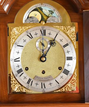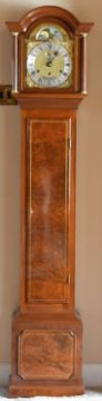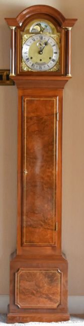 A REPRODUCTION LONGCASE CLOCK BY SINCLAIR HARDING after the style and action of a fine eighteenth century London clock, having a burr-case and a rolling moon dial above Roman Numeral chaptering, 181cms high