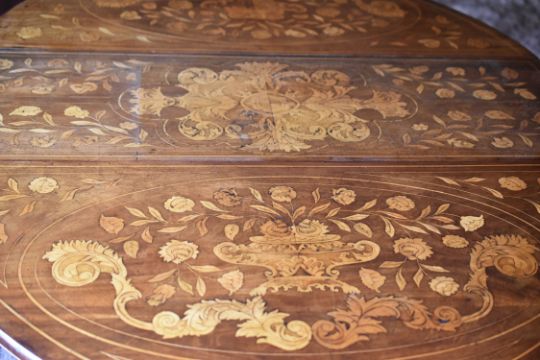 A GOOD INLAID & MARQUETRY EDWARDIAN DROP LEAF TABLE with all round floral marquetry to supports and the entire top, 106cms wide