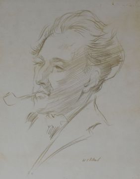 W P ROBBINS pencil drawing - head and shoulders of male smoking pipe, 15 x 12cms