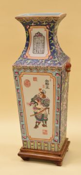 A TWENTIETH CENTURY JAPANESE VASE having a square base, the body tapering to a shaped neck and with mask handles, the neck and body with opposing panels of figures with inscriptions, 47cms high Condition Report: no problems with this item