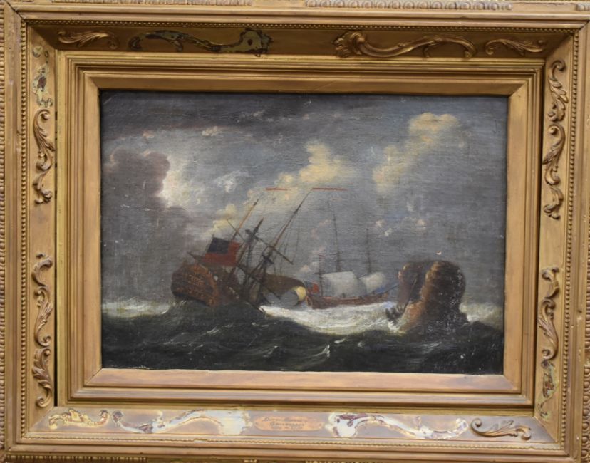 FOLLOWER OF BACKHUYZEN oil on canvas - two Naval vessels in rough conditions, 35 x 51cms