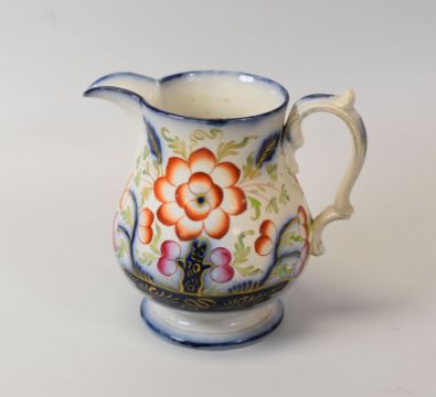 A STAFFORDSHIRE JUG DECORATED IN THE GAUDY WELSH STYLE with circular foot and in cobalt blue, gilding and floral decoration, 17.5cms high