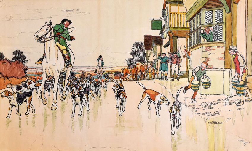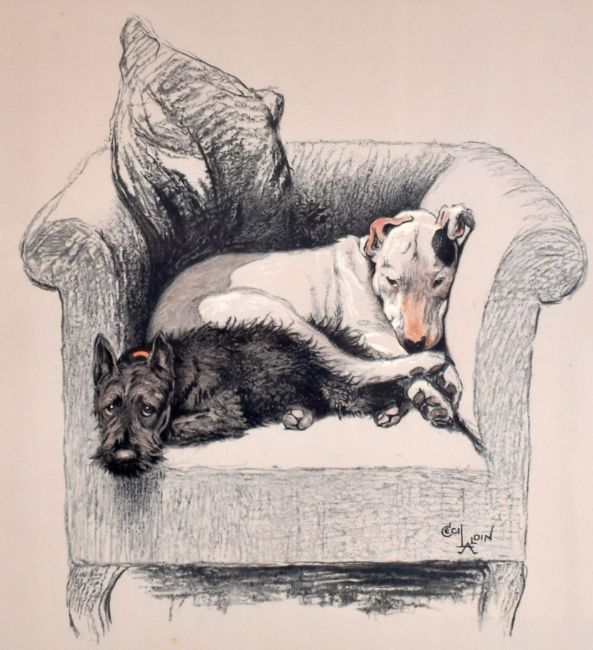 CECIL ALDIN coloured print - hunting scene entitled 'The End of the Day', 36 x 59cms together with a print of two dogs on an armchair entitled 'Weight Will Tell', 55 x 50cms