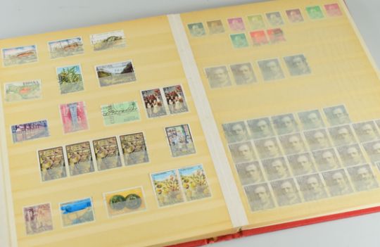 A LEVER ARCH FILE OF PHILATELIC MATERIAL including sheets and blue stamps etc & A RED HARDBACK ALBUM containing a mixture of mainly Spanish stamps
