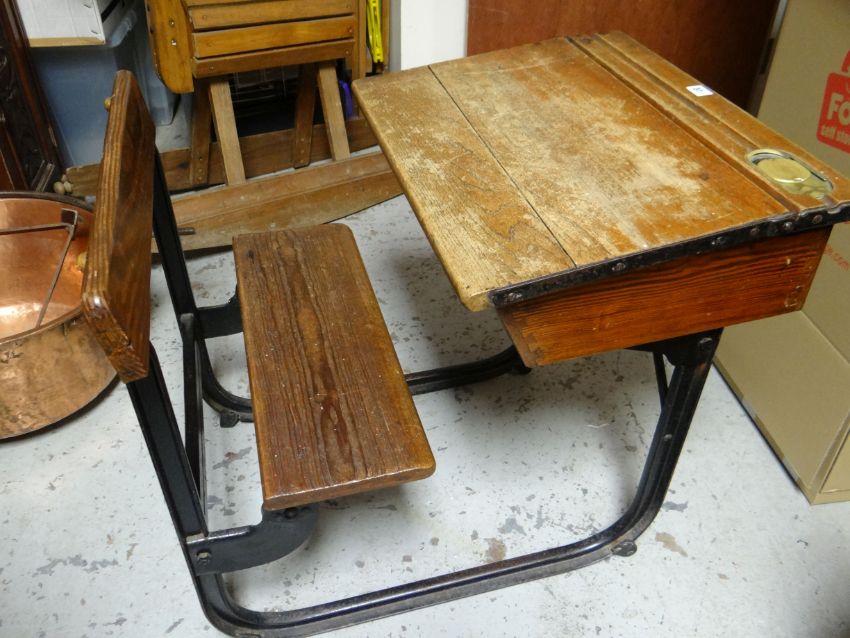 AN ENGLISH VINTAGE SCHOOL DESK & SEAT made by Kingfisher Ltd from wood with iron base, the slope desk hinging and having an inkwell with brass sliding lid impressed 'Kingfisher Ltd West Bromwich', 56cms wide
