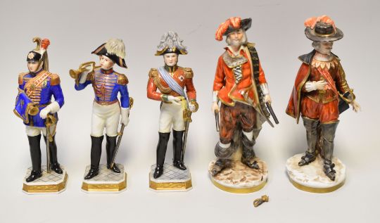 FIFTEEN MISCELLANEOUS CONTINENTAL PORCELAIN HISTORIC MILITARY FIGURES, various factories Condition Report: broken sword handle to one figure (this has been retained and is present), sizes vary but appro 24cms high