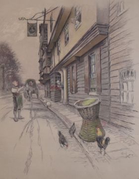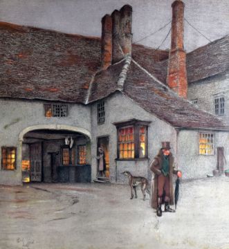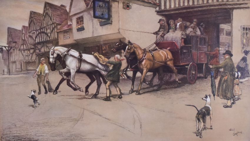 CECIL ALDIN coloured engraving - 'The New Inn, Gloucester', pencil signed, 45 x 37cms together with the coloured etching of 'The King's Head, Chigwell', pencil signed, 41 x 32cms, both embossed with the Fine Art Trade Guild stamp together with a coloured etching of a coaching scene, 23 x 41cms and a framed coloured print in the courtyard, 39 x 36cms