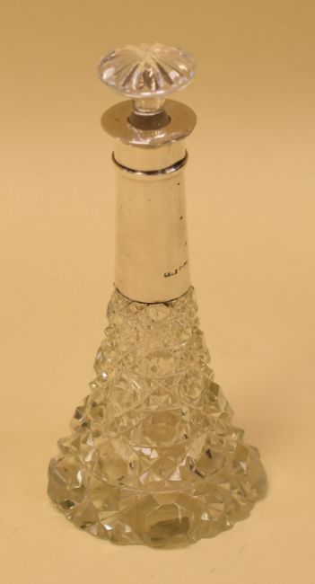 A HOBNAIL-CUT GLASS SCENT BOTTLE WITH SILVER COLLAR, Birmingham 1922