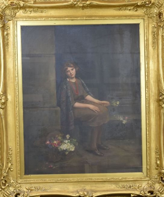 WILLIAM FIRTH oil on canvas - mid twentieth century portrait of a seated female with shawl over shoulders with flower basket and holding a flower, unsigned, 88 x 70cms Provenance: entered by granddaughter of the artist. William Firth was an artist and textile designer who supplied cloth used for the British Army uniforms in WWI.