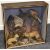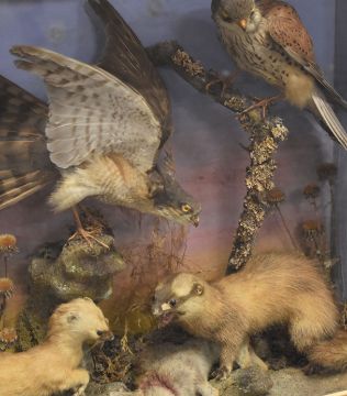 A TAXIDERMY CASE OF SPARROW-HAWKS, WEASELS & RABBIT the hawks perched on a faux rocky outcrop and branch with one leaning down with wings unfurled, the weasels below with rabbit quarry, no labels, early twentieth century, 61 x 61cms