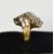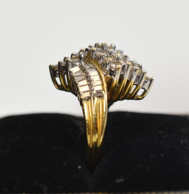 A MODERN MULTI-DIAMOND RING IN 18CT YELLOW GOLD set with many baguette and round cut diamonds in a raised geometric setting, 8.6gms