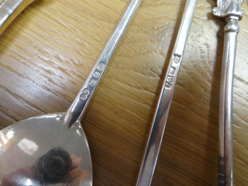 SIX ANOINTING TYPE SILVER SPOONS comprising a plain pair with capped terminals, a near pair with figural terminals, and two with differing mother and child terminals, 9.6ozs Condition Report: no problems, please see images of hallmarks