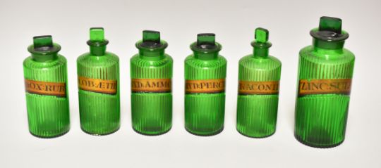 SIX GREEN GLASS ANTIQUE PHARMACEUTICAL JARS WITH LABELS