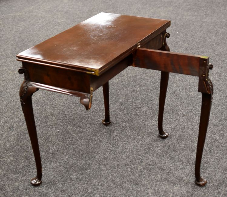 A GOOD TURN OF THE CENTURY MAHOGANY FOLDOVER CARD TABLE on carved shell and cabriole supports, 91cms wide