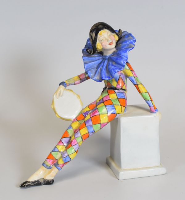 RARE WADE FIGURE OF A HARLEQUIN GIRL perched on a plinth with tambourine and wearing a blue ruffle, the base with red leaping deer mark and WADE in stylized black font, 17cms high Condition Report: substance on surface (oxidised?) but not in our opinion damaged or restored