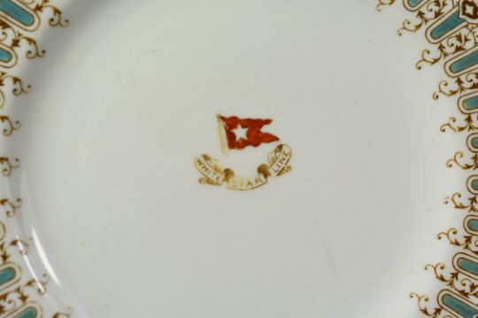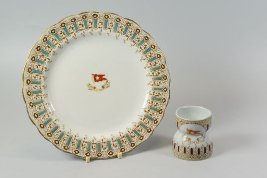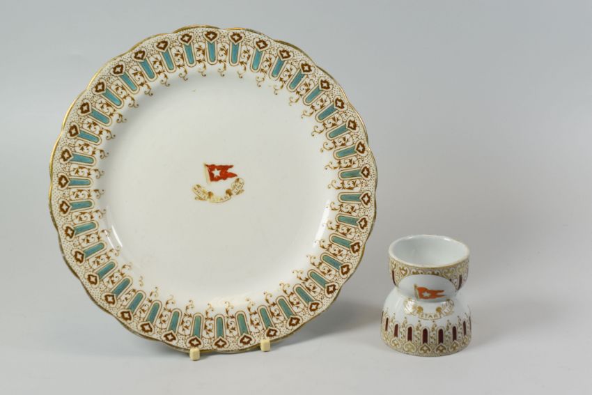 A WHITE STAR LINE POTTERY 'HOLLOW' EGG CUP in brown Wisteria pattern in brown for 2nd class / steerage passengers, dated 1906, 5.5cms together with a White Star Line Wisteria pattern dessert plate for 1st class passengers, 19cms diam Condition Report: without notable damage, extremely small nips/bumps to the edge of the egg-cup but they are extremely small, wear to gilding as expected