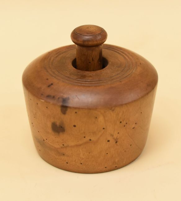 A VICTORIAN CIRCULAR SYCAMORE BUTTER PRINTER to impress a swan decoration and with turned handle, 10cms diam at base