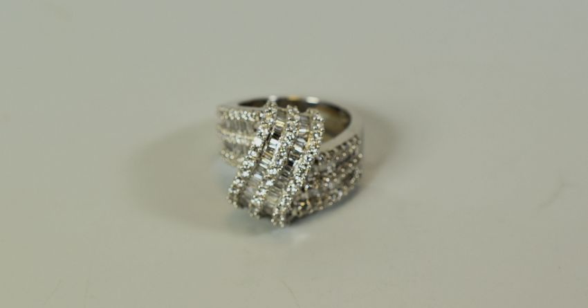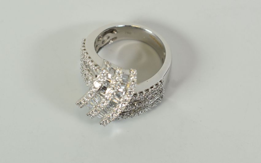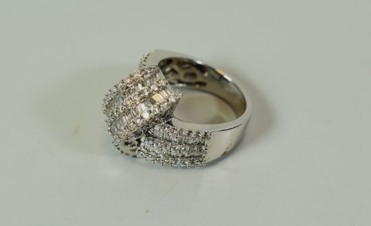 A MODERN 18CT WHITE GOLD DIAMOND CLUSTER RING of folded ribbon design with nine rows of small diamonds and six rows of near square cut diamonds, 11.24gms