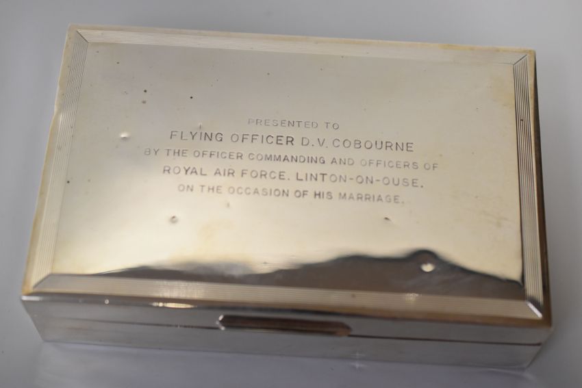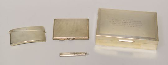 FOUR SILVER ITEMS comprising wood lined cigarette box with RAF inscription, 14cms wide, a 1930s machine-turned silver cigarette case, a convex silver card-case and a silver pencil holder Additional information: box 290gms gross