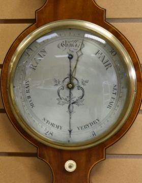 A NINETEENTH CENTURY INLAID MAHOGANY BANJO BAROMETER by J Somalvico, having a circular silver upper dial gauge and with brass campana finial, 106cms high