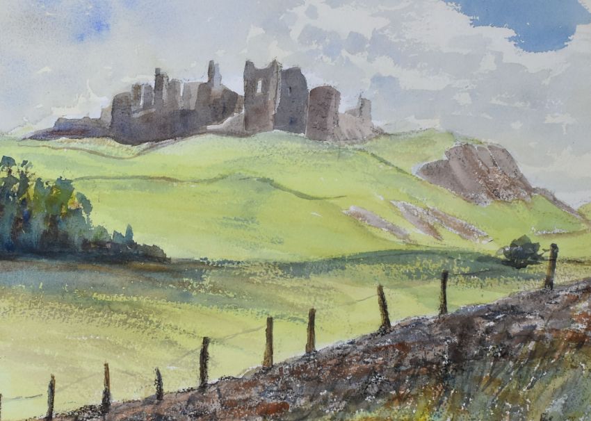D MALING watercolour - view looking up to Carreg Cennen Castle', signed with initials and dated '98, 26 x 35cms