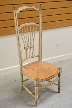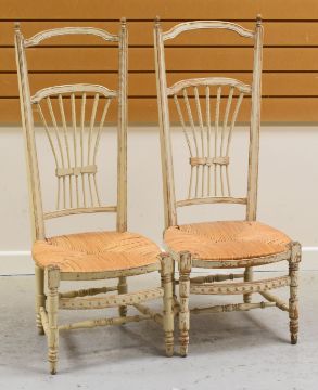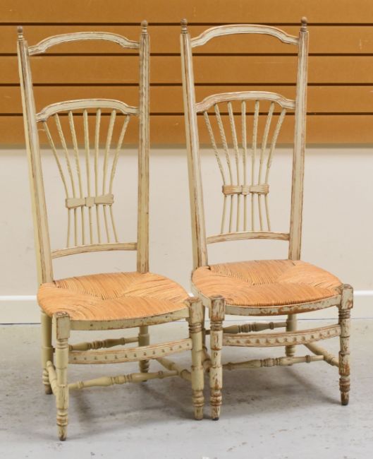 A PAIR OF FRENCH PAINTED PINE FARMHOUSE CHAIRS with rush seats and wheat kernel backs