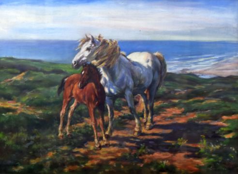WILLIAM FIRTH oil on canvas - standing mare and foal on headland, signed, 50 x 67cms Provenance: entered by granddaughter of the artist. William Firth was an artist and textile designer who supplied cloth used for the British Army uniforms in WWI.