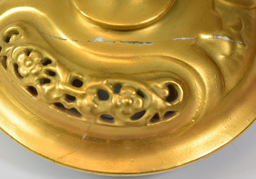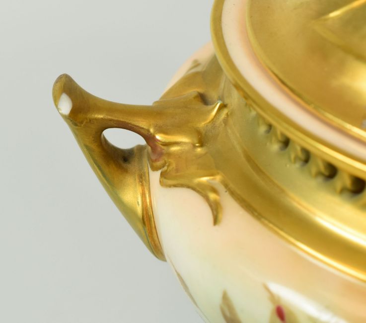 A ROYAL WORCESTER POT-POURRI & COVER raised over an elaborate footed base, having twin handles and the body painted with roses by J F Lexman, signed, 19.5cms high Condition: various damage including cracked cover and chips to base