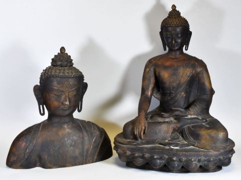 A PAIR OF LARGE METALLIC BUDDAH ORNAMENTS, 80cms high