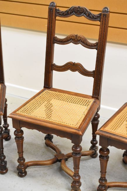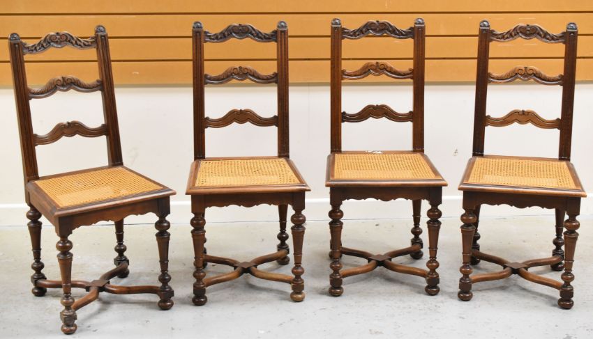 A SET OF FOUR FRENCH CANE WORK CHAIRS having carved ladder backs, carved supports, X-stretcher and caned seats