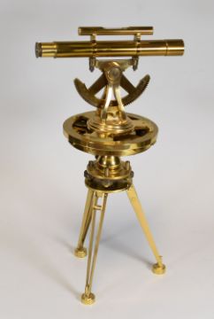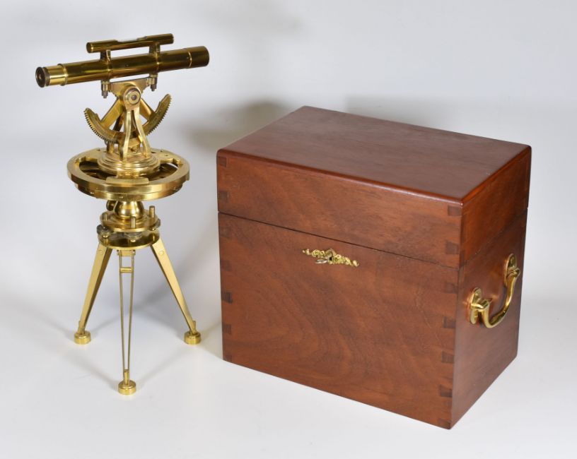 A BURKE & JONES REPRODUCTION THEODOLITE on a tripod stand and with wooden carry case, 37cms high