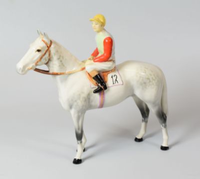 A BESWICK RACEHORSE & MOUNTED JOCKEY the horse in dappled grey, the rider in blue and green silks with yellow capCondition Report: no problems such as chips or nicks / breakages or repairs. Beswick ‘shield’ stamp to base