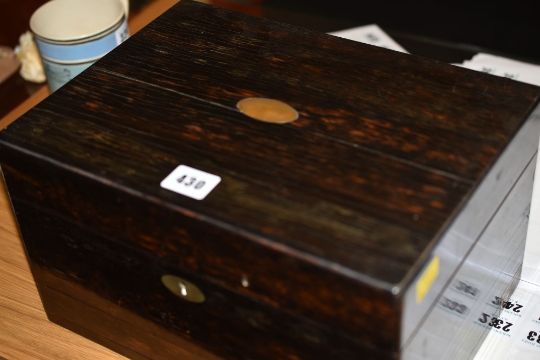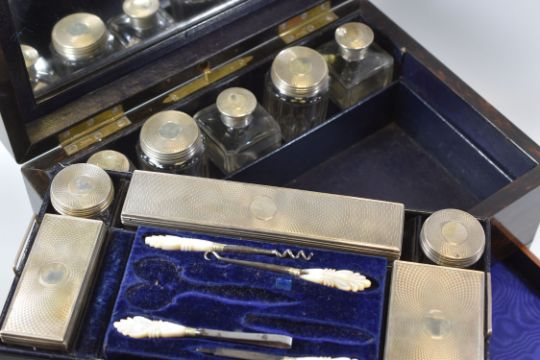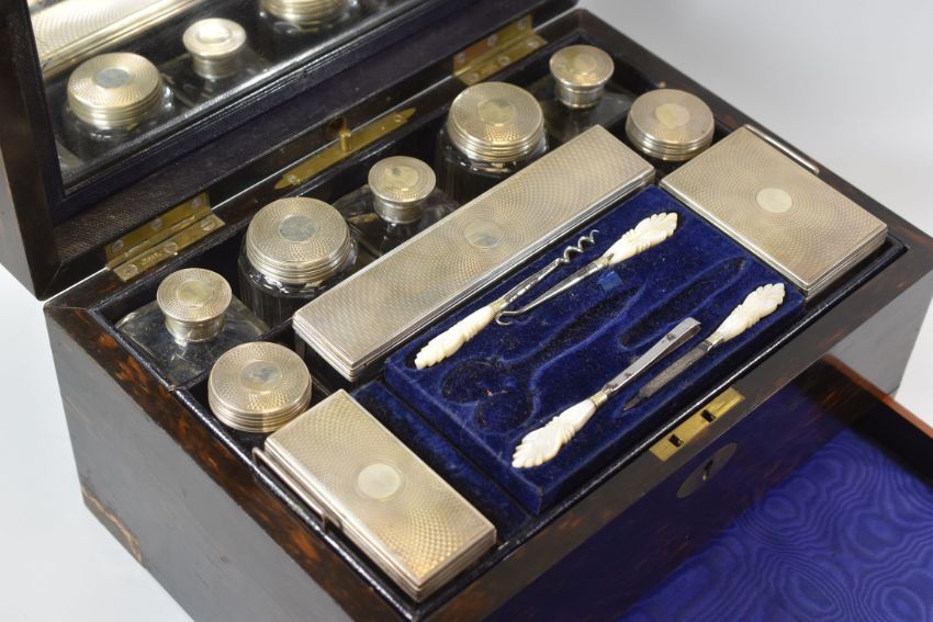 A COROMANDEL VANITY BOX WITH FITTED SILVER CONTENTS bearing maker's label for Stocken & Co, the hinging lid with mirrored interior and with button for release of base drawer, near complete contents including ten glass containers with machine turned silver lids, marks for Pittway Bros, London 1860 Provenance: collection of folk-singer Mary Hopkin Condition Report: externally the veneer has rippled and lifted slightly particularly on the top, the contents are in good condition without damage to glass or silver, the mirror is also in good condition without notable silvering or cracks etc