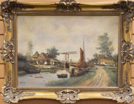 A J FELS oil on canvas - Dutch canal scene with moored boats, bridge and distant windmill, signed, 48 x 68cms