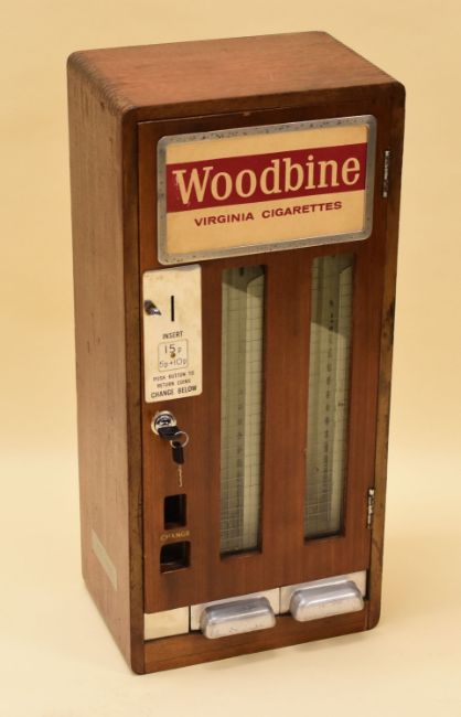 A VINTAGE CIGARETTE DISPENSER FOR WOODBINE in an oak case, 'INSERT 15p' with key (with staff for safe keeping), 67cms high