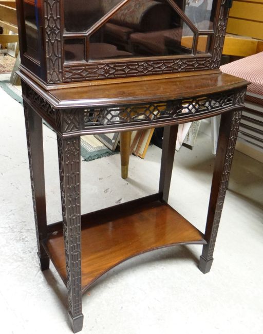 AN ANTIQUE MAHOGANY SINGLE DOOR CABINET ON STAND with lower tier, carved tapered legs and apron and with an astragal glazed door and pierce work pediment, 190cms high x 62cms wide